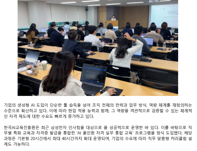 미래는 AI가 인간을 대체하는 것이 아니라, AI를 잘 활용하는 사람이 앞서가는 시대입니다. 서울디자인재단이 보여준 혁신의 의지처럼, 귀 기관의 임직원들이 디지털 전환의 파도에 유연하게 올라탈 수 있도록 한국AI교육진흥원이 든든한 파트너가 되겠습니다.